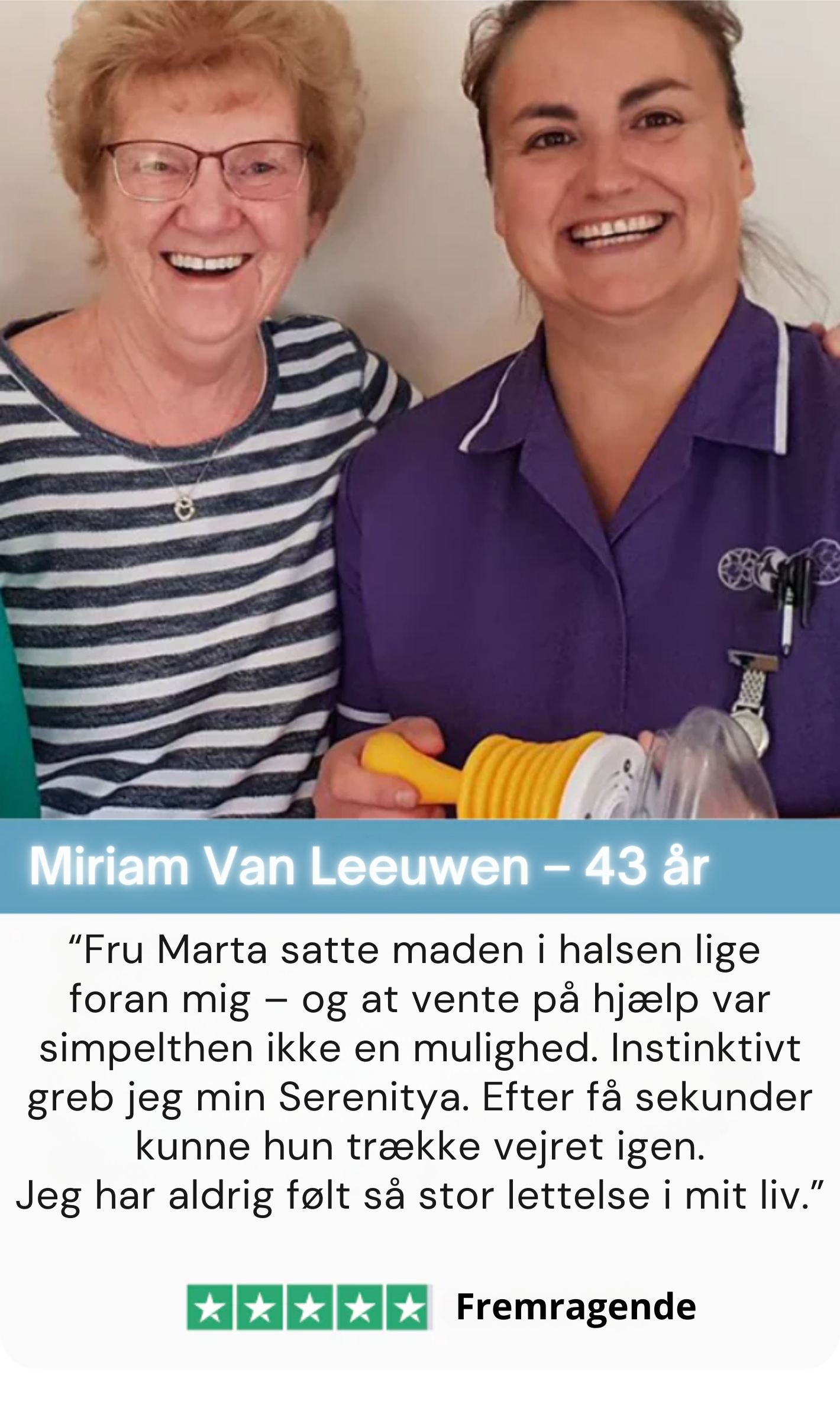 For fire måneder siden satte min morfar maden i halsen under middagen. Ingen vidste rigtig, hvad vi skulle gøre. Siden den dag lovede jeg mig selv at finde en løsning. Da jeg opdagede Serenitya, bestilte jeg den med det samme. Bare visheden om, at vi nu har den derhjemme, giver mig en enorm ro i sindet.
