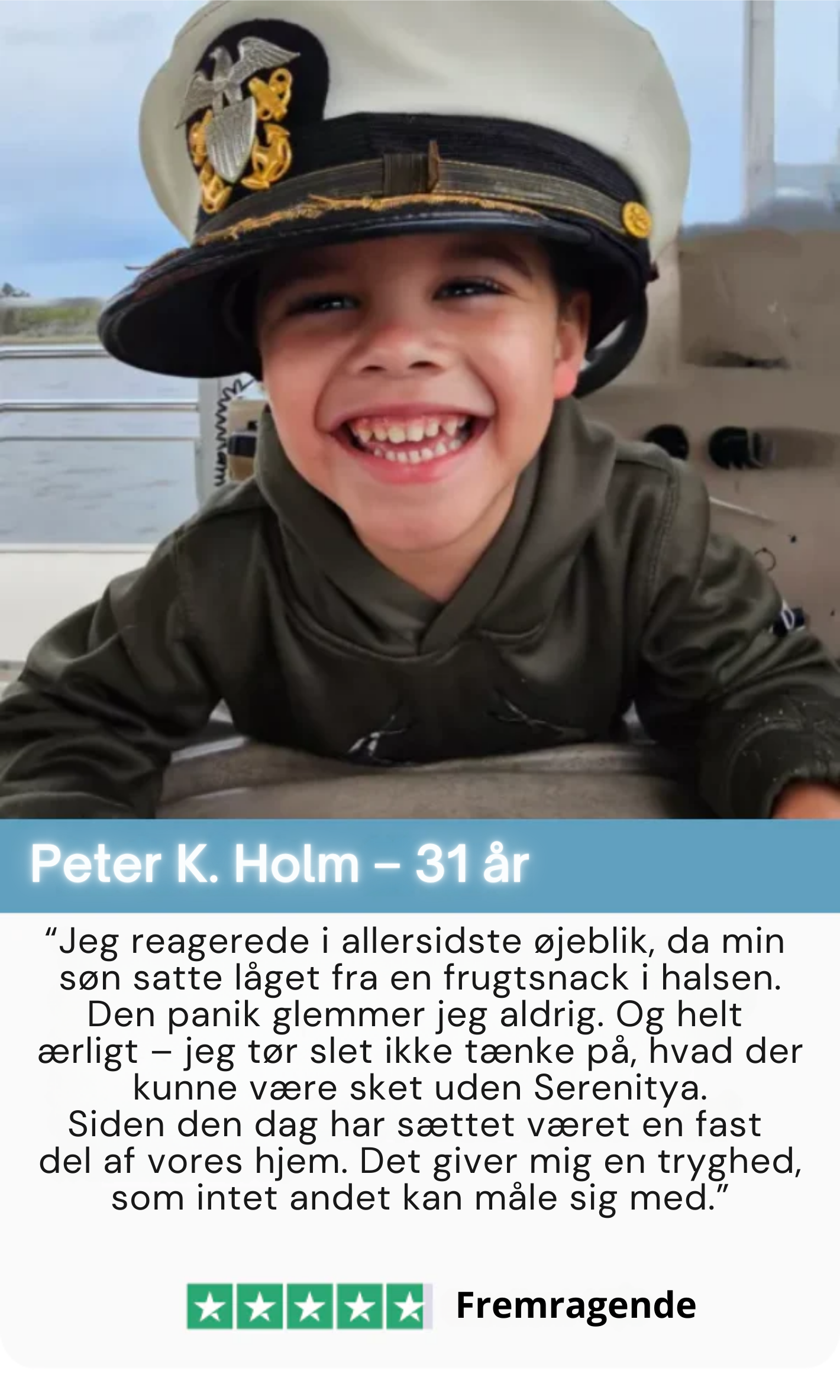 Jeg var ikke engang hjemme, da det skete, men min kone brugte Serenitya på vores 7-årige søn. Han satte et dårligt tygget stykke pølse i halsen – det kunne være endt helt galt. Siden den dag har hun altid Serenitya i tasken, når hun er ude med børnene. Det er blevet en naturlig livredder-rutine for os.