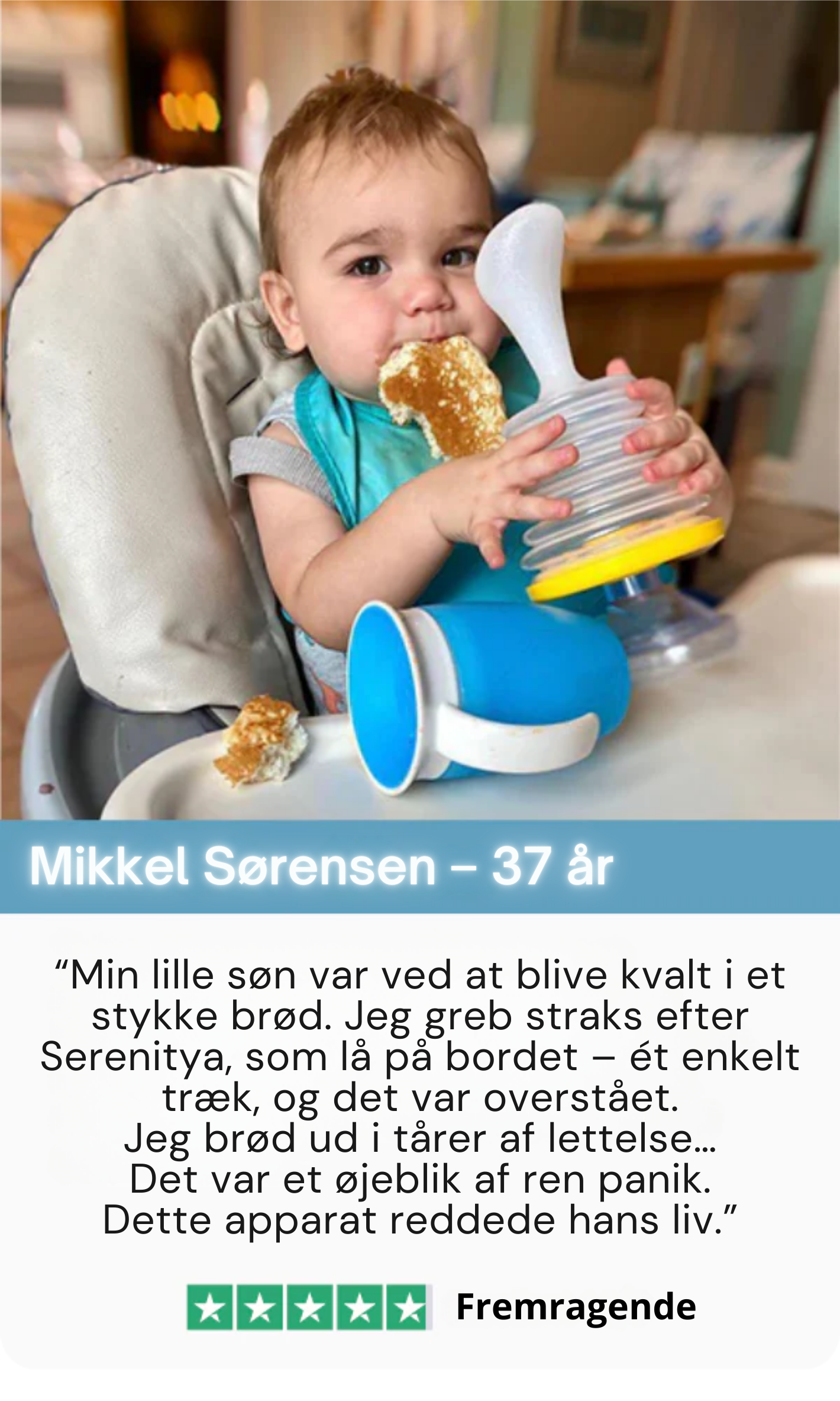 Jeg var ikke engang hjemme, da det skete, men min kone brugte Serenitya på vores 7-årige søn. Han satte et dårligt tygget stykke pølse i halsen – det kunne være endt helt galt. Siden den dag har hun altid Serenitya i tasken, når hun er ude med børnene. Det er blevet en naturlig livredder-rutine for os.