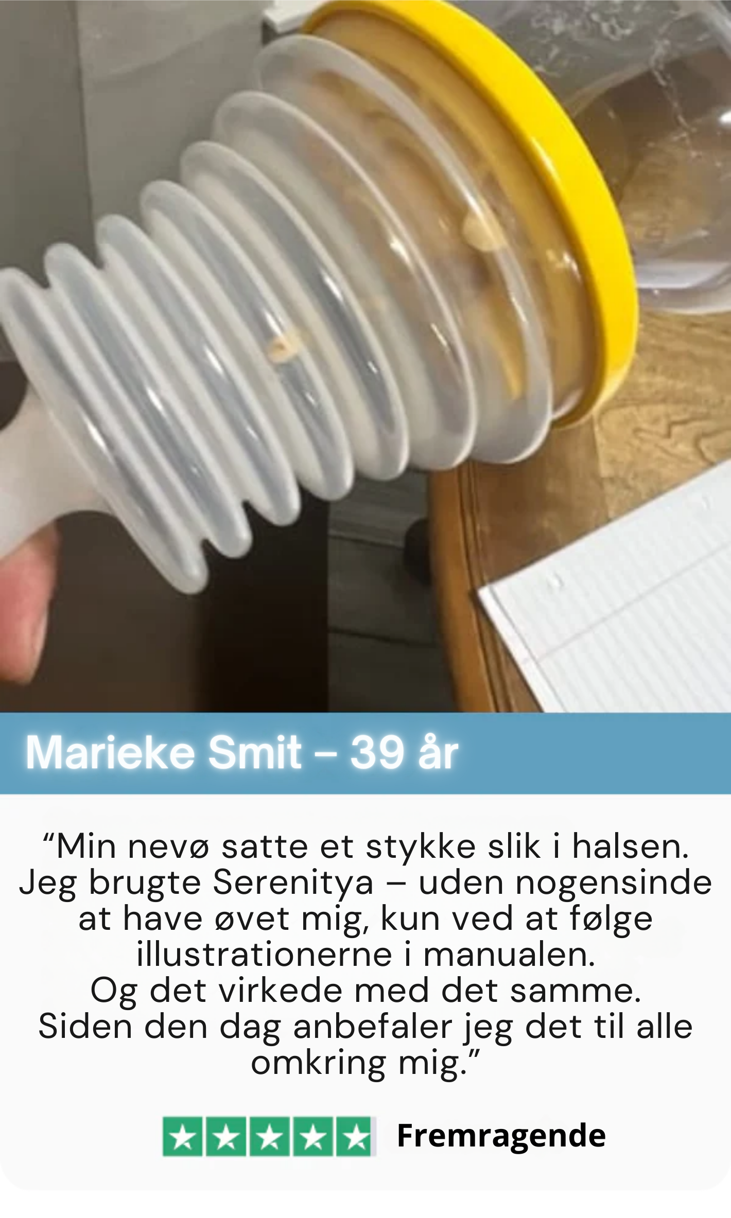 For fire måneder siden satte min morfar maden i halsen under middagen. Ingen vidste rigtig, hvad vi skulle gøre. Siden den dag lovede jeg mig selv at finde en løsning. Da jeg opdagede Serenitya, bestilte jeg den med det samme. Bare visheden om, at vi nu har den derhjemme, giver mig en enorm ro i sindet.